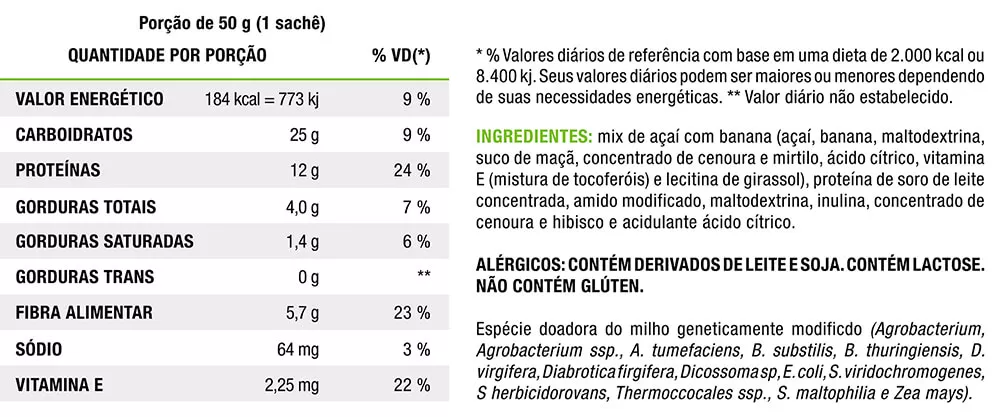 Com 12g de Proteínas, 184Kcal, Vitamina E, Fibra e adoçado naturalmente com polpa de banana e maça!