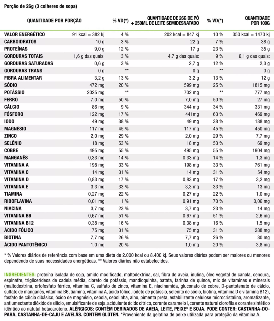 Fornecem 23 vitaminas e minerais, fornecem 18 g de proteínas por porção, 100% das proteínas são de alto valor biológico, contêm todos os aminoácidos essenciais em proporções ideais para suprir as necessidades de proteínas do organismo, Contêm mais de 1/3 das necessidades diárias de cálcio.
