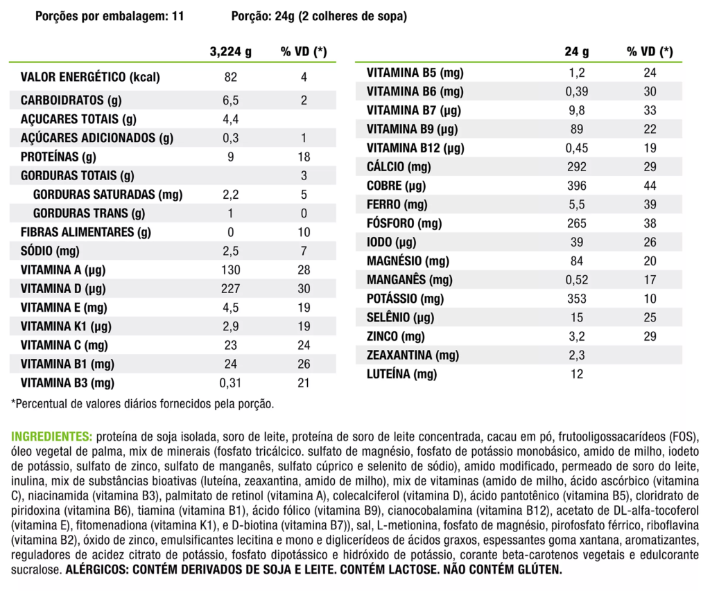 Contém blend proteico exclusivo com proteína isolada de soja e proteína do soro do leite: mix de proteínas com todos os aminoácidos essenciais para nosso corpo! Uma combinação de nutrientes que auxiliam no metabolismo, na manutenção da saúde dos olhos e na diminuição de radicais livres relacionados ao processo de envelhecimento. Cuidadosamente pensado para te ajudar a suprir suas necessidades de forma prática e saborosa!