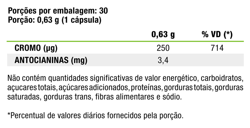 Um suplemento alimentar que combina dois ativos, a laranja moro que favorece a quebra de gordura e a redução de medidas¹ e o cromo, que auxilia no metabolismo de proteínas, carboidratos e gorduras e contribui para a manutenção dos níveis de glicose e insulina no sangue. Níveis normais de insulina colaboram para o controle do apetite.