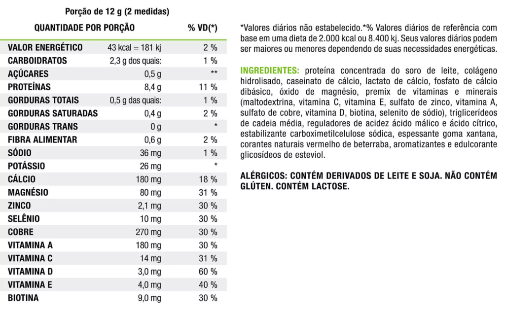 Vitaminas A e B3, biotina e zinco: contribuem para a manutenção da pele | Vitamina E, cobre, selênio: auxiliam na proteção dos danos causados pelos radicais livres | COM 8,4 G DE PROTEÍNA POR PORÇÃO (COLÁGENO + WHEY)